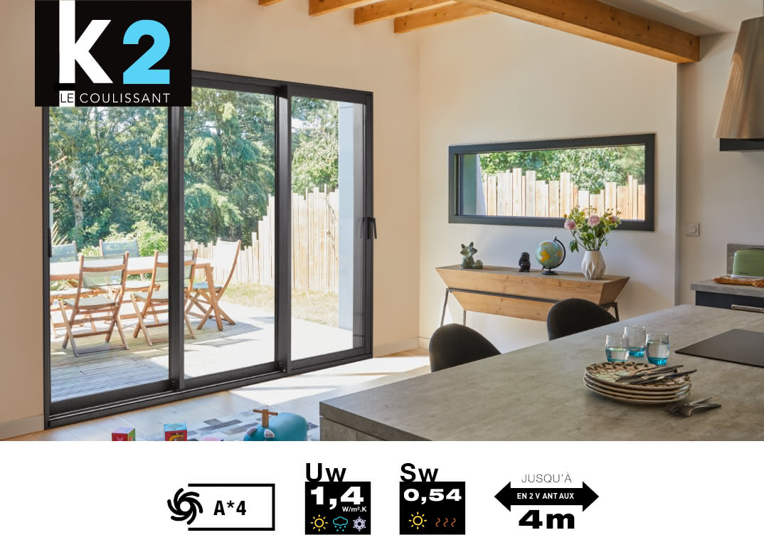 K2, notre nouvelle génération de baies vitrées offre des surfaces vitrées augmentées pour favoriser les apports solaires et la transmission lumineuse. Les profilés aluminium, à rupture de pont thermique, sont caractérisés par leur finesse et présentent deux designs intérieurs au choix. L’infiltrométrie a fait l’objet d’un attention totale avec des pièces d’étanchéité choisies pour leurs très hautes performances à l’air, à l’eau et au vent.